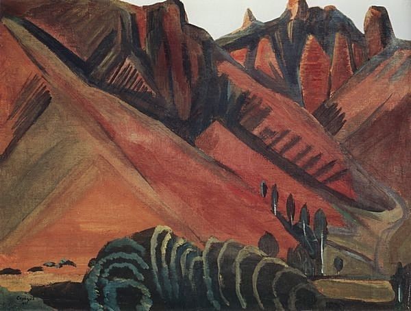 Editor: Here we have Martiros Sarian's "Sunny Landscape" from 1923, rendered in oil paint. The colors are so vivid and simplified, almost childlike, but not quite naive. The mountain dominates the scene... What do you make of it? Curator: The heavy impasto and bold color choices are what grab my attention. Look at how Sarian builds the mountain out of layers of thick paint. Considering the time, 1923, what socioeconomic factors were impacting access to pigments and how might that play out in an artist's choices regarding paint application and composition? Editor: So, perhaps the directness is born out of necessity or availability? Rather than striving for photorealism, Sarian works with what he has... Curator: Precisely! This isn't just about aesthetic preference. Think about the cost of materials, the labor involved in sourcing and preparing pigments, especially during times of scarcity. How accessible were different colors, and what statements are being made with what IS emphasized through availability? Sarian transforms those limitations into his artistic expression. The materiality becomes the message. Editor: So, by focusing on the materials and the production, we get a richer understanding than just saying "oh, it's a colorful landscape." Curator: Exactly. Consider also where Sarian was working. Were these pigments locally sourced? How might the act of acquiring materials itself be embedded within the meaning of the landscape being represented? The labor and the location—it’s all intertwined. Editor: It makes you consider all the steps to create it beyond just inspiration. The art embodies social processes that otherwise seem distant from our encounter with a painting. Curator: Precisely!