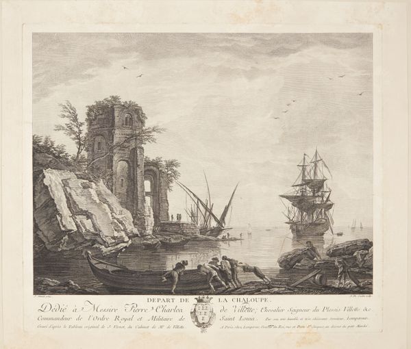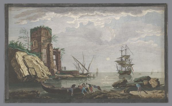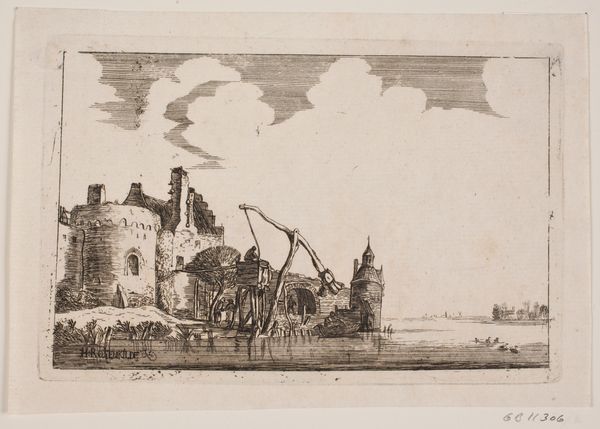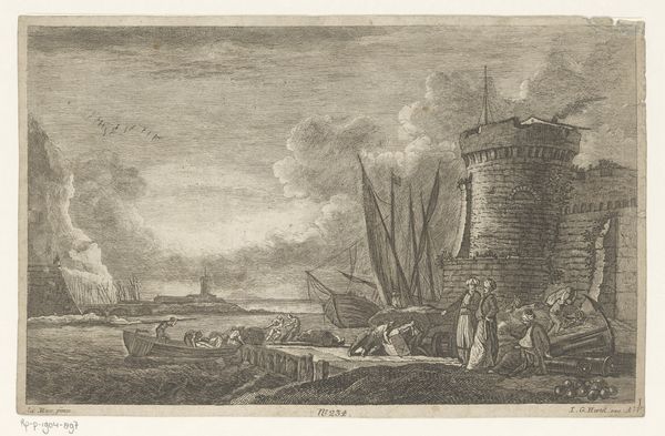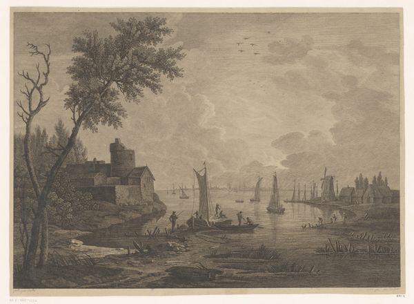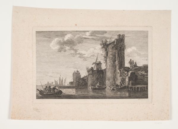 Johanna Fosie created this print, "Ships on a River, with a Tower to the Left," using engraving, a skilled process of cutting lines into a metal plate. Look closely, and you'll see how the network of etched lines defines the image. See how Fosie varies the density and direction of these lines, creating tone and texture – from the rippling water to the cloudy sky. Engraving is labor-intensive, demanding precision and control. The engraver uses a tool called a burin to carve the image into the metal. Ink is then applied to the plate, and the surface is wiped clean. The ink remains in the etched lines, ready to be transferred to paper under great pressure. In Fosie’s time, prints like these were valued for their ability to disseminate images widely. They played a vital role in circulating visual information, functioning as a kind of pre-photographic distribution network. This print, therefore, represents not just an image, but also a sophisticated system of production and consumption.