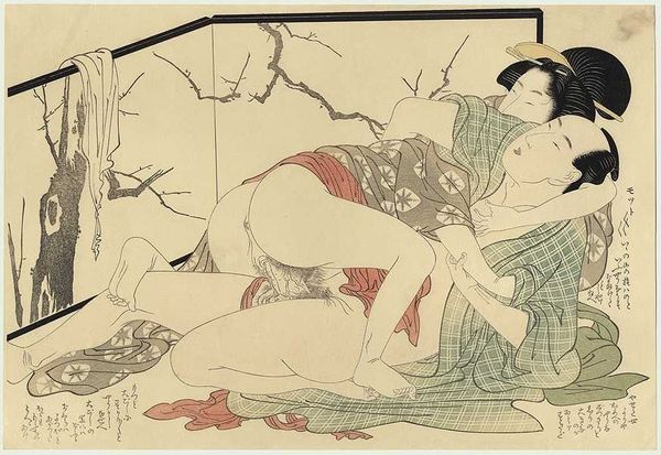This print, by Kitagawa Utamaro, was made in Japan using woodblock printing, a technique known as *ukiyo-e*. Its flat planes of color and delicate lines result from a labor-intensive process: each color you see required a separate block, carefully carved and then printed in precise registration with the others. The *ukiyo-e* tradition was closely tied to the rise of a merchant class in Japan, catering to their tastes with images of pleasure and entertainment. Utamaro elevated the genre with his focus on individual expression and the intimate details of everyday life. The soft textures and subtle gradations of color speak to the skill of the artisans involved, their work often unacknowledged in favor of the artist's signature. So, the next time you look at an *ukiyo-e* print, remember to appreciate not just the artist's vision, but also the collaborative labor and the complex social context that made it possible.