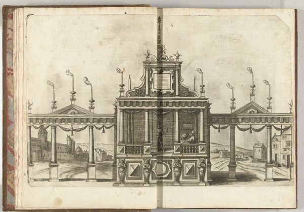 Editor: Here we have "The Spanish Triumphal Arch (front)," an engraving and print dating to 1599 by Pieter van der Borcht the First, held at the Rijksmuseum. It's... rather exuberant, isn't it? A bit chaotic. The amount of detail is astounding. What's your read on it? Curator: It’s indeed a fascinating visual document. These temporary triumphal arches were a form of political theater, potent propaganda tools. In the late 16th century, the Spanish Habsburgs sought to project an image of power and piety across Europe. What strikes you about the imagery displayed? Editor: There seems to be a mix of classical and religious iconography. The architecture evokes ancient Roman arches, but there are also figures that look like saints. The plumes of smoke feel dramatic, even theatrical. Curator: Precisely. These arches were designed to shape public perception. The Spanish were very keen on using displays of wealth and piety to cement their power during a politically fraught era of religious wars and uprisings. Notice how the arch presents a particular narrative to viewers; who do you imagine this performance was primarily aimed towards? Editor: Perhaps the local population in the Netherlands, to impress upon them the might and divine right of the Spanish rulers? It almost feels like a carefully constructed PR campaign in visual form. Curator: Exactly. Think about the very *act* of creating and distributing a print of such a fleeting architectural structure; the intent would have been to extend the life and influence of the Habsburg brand. And where do you think the common people factor into this campaign? Were they persuaded? Did they resist? That is where the most complex stories often reside. Editor: That is a fantastic way of looking at it! I now see this artwork as not just a pretty picture, but as a piece of political messaging, a window into a power struggle. Thanks! Curator: Indeed. Understanding art in this context helps us to decode the motivations and anxieties of past societies. A worthwhile lesson!