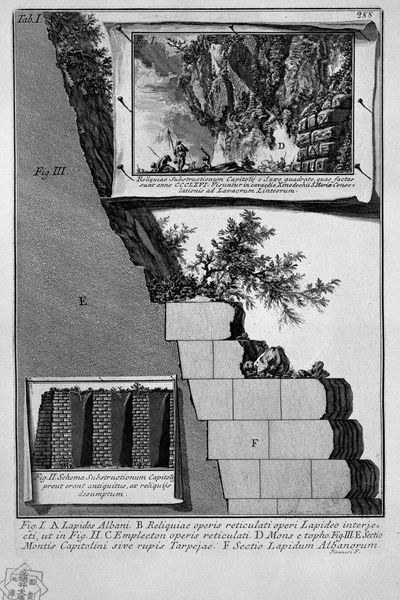 Curator: Here we have a print entitled "Following the above table" by Giovanni Battista Piranesi. The composition utilizes engraving and etching. I find the meticulous detail captivating. What strikes you first? Editor: It has such a compelling, melancholic beauty. The strong linear quality feels almost architectural itself, doesn't it? Even without people populating the space, there's a definite sense of human presence, a ghost of industry almost. Curator: Absolutely. Piranesi's architectural prints are famous for this sense of a looming, powerful history, often intertwined with themes of decay and the passage of time. They resonate deeply because they make us contemplate the relationship between grand human endeavors and eventual ruin. Editor: That reminds me of the persistent human need to leave some mark. Notice the heavy, block-like forms. Their stark, geometrical weight lends a monumental, almost tomb-like feeling, hinting at eternity and legacy. The crumbling away only accentuates this yearning for permanence, I believe. Curator: It’s worth noting Piranesi's historical context, too. During the 18th century, there was widespread fascination with antiquity, a rising of archaeologomania that influenced many artists. Piranesi participated in and certainly further fueled the aesthetic of the ancient world through prints like this one, making them accessible to a wide audience. Editor: That interest certainly reveals itself here in the symbolic depiction. Even the visual style – the detailed lines and contrast – it evokes classical engravings on sarcophagi, connecting the work with cultural ideas surrounding antiquity, death, memory, even stories and myths of what might come after this earthly plane. It almost transforms the location, a drawing for an underground chamber connected to Lacus Albani or Lake Albano near Rome, into the realm of Hades. Curator: That intersection of precision and romanticism is, I think, a significant aspect of Piranesi’s appeal and why the images were popular amongst a wealthy, educated elite across Europe and in the Americas. What would you want listeners to remember most when viewing this print? Editor: Perhaps that objects and locations hold embedded emotions and stories of longing. Things thought static are, through art like this, shown as repositories of human emotion. Curator: A perfect reflection on art's purpose, wouldn't you agree? To reveal hidden stories within the architecture around us, rendered permanent in prints and the memory.