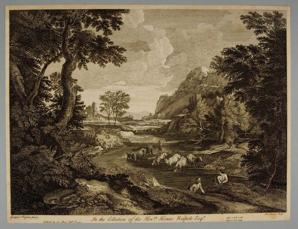 Editor: Here we have François Vivares’ "View of Tivoli," currently residing at the Harvard Art Museums. It's rendered in black and white, and the detail is incredible. What draws my eye is the way the artist captured the city on the hill. What do you see when you look at it? Curator: I'm drawn to the materiality of the printmaking process itself. Consider the labor involved in creating these intricate lines, each one etching away at the metal plate. How does this mass-produced image affect our perception of a place like Tivoli, transforming it into a commodity for consumption? Editor: So you are saying it's about making places reproducible? Curator: Exactly! The image becomes separated from the actual experience of the place, mediated by the artist's skill and the printing press's capability. It makes me wonder about the social context of landscape prints like this and how they were bought and sold. Editor: That gives me a completely different perspective than I had before. Thank you!