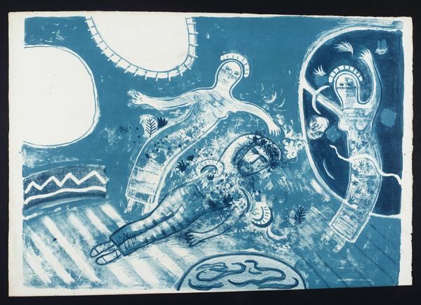 Editor: This is "Petroglyph - Human Figures" a drawing made sometime between 1935 and 1942. I find it fascinating how the artist, Lala Eve Rivol, abstracts human forms into these geometric, almost symbolic shapes. What do you see in this piece beyond the figures themselves? Curator: I see a visual language deeply rooted in Indigenous Americas' storytelling traditions. It’s crucial to acknowledge that these aren’t just aesthetic choices; they are cultural and historical records. Think about the erasure and misrepresentation of Indigenous cultures during that period. This work becomes an act of resistance, preserving and celebrating a heritage often marginalized. How do these figures interact with each other, and what stories might they be telling? Editor: They seem disconnected, almost floating in this grey space. Is that space significant? Curator: Absolutely. The undefined space emphasizes the disruption and displacement experienced by Indigenous communities. The lack of a grounded context speaks to the loss of land and traditional ways of life. Each figure, isolated yet interconnected, might represent fragmented histories, resisting assimilation and asserting a continued existence. What emotions does this sense of isolation evoke in you? Editor: A sense of resilience, maybe? That even separated, there's a shared visual language. Curator: Precisely. It challenges dominant narratives, reminding us of the power of art to reclaim and redefine identity. Considering the timeframe, doesn't it prompt reflection on the ongoing struggles for Indigenous sovereignty and cultural preservation? Editor: Definitely. I hadn’t considered it in that context. Thanks, that really shifted my perspective. Curator: It’s a privilege to engage with art that demands we confront history and consider contemporary social justice issues.