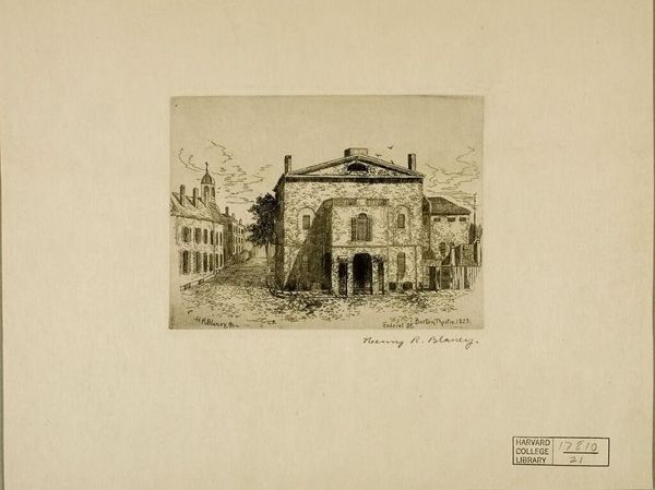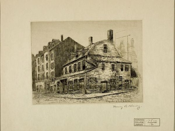 Editor: This is Henry Robertson’s etching, "The Birthplace of Paul Revere." It's quite small, and the detail is incredible. What strikes me is how unremarkable the site seems – almost mundane. How do you interpret this work? Curator: The image is interesting in its depiction of history. Robertson, working in the 20th century, frames a revolutionary landmark as an everyday scene. What does that say about how we, as a society, choose to remember our heroes and historical events? Editor: That's a great point! It makes you think about the politics of place and memory. Curator: Exactly. The "Birthplace" becomes less a monument, and more a stage for daily life, inviting a different kind of reflection on Revere's legacy. Editor: Thanks, that really changes how I see it.