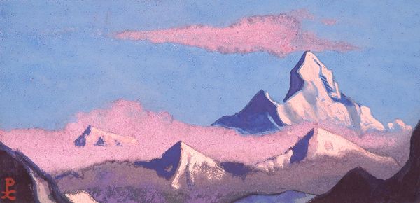 Editor: So, this is "She Who Leads" by Nicholas Roerich, painted in 1944 using oils. The cool tones give the mountainscape an otherworldly feeling, almost dreamlike. There are two figures making their way up a very steep climb – I'm intrigued. What’s your take on this piece? Curator: You're right; the painting hums with a sense of otherworldliness, doesn't it? For me, Roerich captures the almost mystical allure of the Himalayas that he explored extensively. I imagine him high in the mountains—freezing air filling his lungs—brushstrokes alive with the journey. Notice how the sheer scale of the mountain dwarfs the figures, highlighting their bravery, or perhaps, their vulnerability? Does that come across to you as well? Editor: I can see the bravery and the vulnerability. It is as though they are guided and protected in this monumental landscape. Who exactly do you think 'she' is referring to, in the title? Curator: Roerich often embedded spiritual meaning into his landscapes. 'She' could be interpreted in various ways—as a deity, the feminine divine, or perhaps even a metaphor for intuition, for the inner voice guiding us on our own difficult ascents through life. What do the colours evoke in you – especially the contrast of darker blues in the lower reaches against the bright snow? Editor: The blue conveys this calmness while also signaling the perilous climb ahead. The light guiding 'her' really shines on this dangerous path. It’s a fascinating piece that really stays with you. Curator: Exactly. Roerich masterfully marries the seen with the unseen, creating something so incredibly hopeful! Editor: This was great; I think I understand the symbolic intention more clearly now. Curator: My pleasure! Sometimes, the greatest discoveries come from looking inward and simply feeling the essence of a painting.