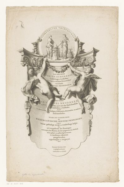 This title page with text in cartouche was created by an anonymous artist. The work is an engraving, notable for its symmetrical arrangement and intricate detail. At the center, an oval cartouche dominates, framed by curving, wing-like extensions and topped with a cherubic head radiating light. The composition employs a visual hierarchy, drawing our eyes first to the title and then downward through the text. Below, crossed tools symbolize the artistic process, grounding the ethereal quality of the upper elements. The artist's skill is evident in the fine lines that define the forms, creating a delicate balance between textual and visual components. The very structure of the engraving, with its emphasis on order and clarity, mirrors the Enlightenment's pursuit of rational thought and aesthetic harmony. Yet, within this formal structure, the expressions of the soul hint at the complexities of human emotion, suggesting a tension between reason and passion that defines much of the artistic production of the period.