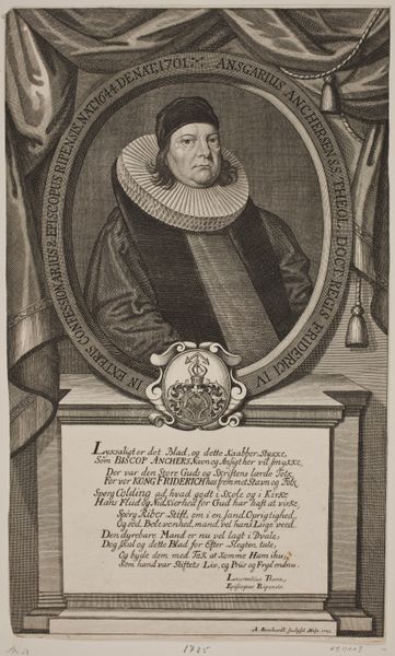 Editor: This is a portrait of Paul Weber by Andreas Matthäus Wolfgang, engraved in 1696. I find it interesting how the subject is framed by an oval, surrounded by text. What stands out to you about this image? Curator: I see a man defined by his faith and intellectual pursuit. The book he holds, the somber attire, and the very lettering surrounding him speak to a life dedicated to a higher purpose. Consider the weight of those symbols in shaping identity. What is "Weber" communicating through these choices? Editor: So, the symbols aren't just decorative; they define the subject's essence? Curator: Precisely. The engraving captures a deliberate self-presentation, deeply rooted in religious and scholarly traditions. These choices tell a story, a narrative constructed through visual cues. Editor: That gives me a new perspective on portraiture, thinking about the stories behind the symbols.