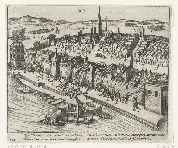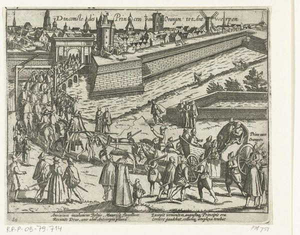 This engraving, made in 1585 by an anonymous artist, captures the Entry of the Duke of Parma into Antwerp. The black lines create a detailed image of the city and the Duke's procession. The high angle gives us a view of the city's layout, divided into distinct zones. The composition is structured around the Duke's procession, moving from the lower right toward the city center, drawing our eye to the architectural details of Antwerp. We see a careful arrangement of the buildings and fortifications. The artist uses linear perspective to convey depth, with the lines converging towards a vanishing point within the city. The formal choices invite us to consider how power and space are represented. The Duke's entry symbolizes a shift in political control and suggests a new spatial order imposed upon the city. The artist's attention to detail transforms the city into a site of political meaning.