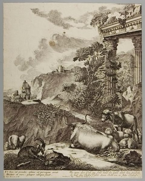 Curator: Let's look at this etching by Albert Christoph Dies, "Tempy della Sivilla (sic) e di Vesta a Tivoli," which translates to "Temple of the Sibyl and Vesta at Tivoli." Editor: Oh, wow, it’s incredibly detailed! All those tiny lines...it gives me a sense of being lost in a vast, romantic wilderness. A little melancholy, maybe? Curator: Exactly! The artist emphasizes the contrast between the imposing classical architecture and the untamed natural world. The Temple is almost being overtaken by the landscape. Editor: It's like nature is patiently reclaiming what was once its own, you know? There's a figure at the base, so small amidst this grandeur, contemplating the scene. Makes you feel...fleeting. Curator: I think Dies is interested in the sublime—the power of nature to overwhelm and inspire awe. He masterfully uses hatching and cross-hatching to create depth and texture. Editor: I see that. It’s a reminder that everything, even the grandest structures, are temporary against the backdrop of time and nature. Thanks for pointing that out!