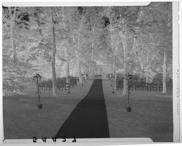 Curator: This is an Untitled photograph by Martin Schweig, housed here at the Harvard Art Museums. It captures the back view of what appears to be an outdoor wedding. Editor: My first impression is one of stark contrast. The strong linear perspective draws the eye down a dark aisle, flanked by lighter figures and trees, creating a sense of depth but also almost a barrier to the figures at the far end. Curator: Indeed, the formality of the wedding contrasts with the natural setting, perhaps reflecting a desire to publicly legitimize a union within a somewhat untamed context. Editor: The inverted tones add a layer of abstraction. It is almost dreamlike. The texture seems rough, emphasizing the materiality of the photograph itself. Curator: The photo offers an interesting insight into a social ritual, where nature is both a backdrop and a stage for personal milestones. Editor: A compelling piece, where formal elements like contrast and perspective serve to amplify the sense of a life-changing moment.