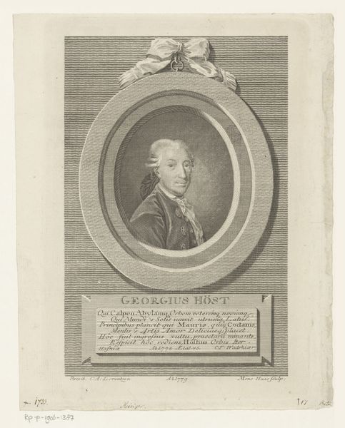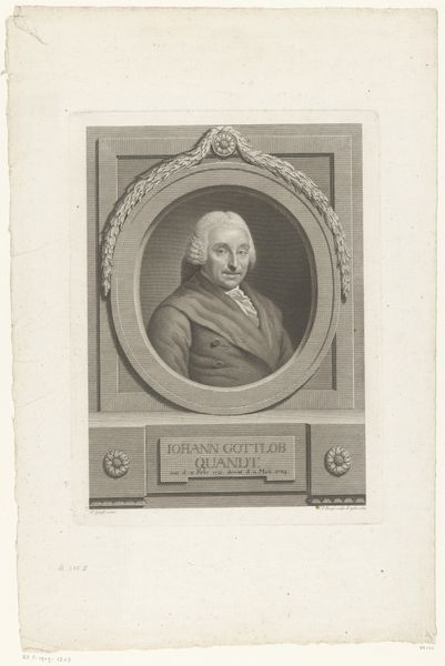 Curator: Ah, here we have a captivating engraving: “Portret van Johann Aloys Schneider.” It was created between 1770 and 1788 by Friedrich Grögory, during a period when portrait engravings gained considerable popularity. Editor: Immediately, there's this stillness. A quiet reserve. The oval frame is almost oppressive, as though this musician has been pinned, like a butterfly. It really conveys someone held in position and purpose. Curator: That formal setting reflects a very deliberate public image. Schneider was clearly a figure of some stature. You can tell this engraving, baroque in its detailing, was probably commissioned to mark an achievement or signal a role in the electorate. He holds the position of Churfürstl. Stift. Capelln, someone connected to the church leadership. Editor: Do you think the artist chose that very tightly cropped composition to symbolize control over self, over the chaotic artistic temperament people might have expected of a musician? Is that severe, plain coat also a kind of calculated…uniform? Curator: Precisely! Look how the portrait, although commemorative, has echoes of state history painting—Grögory uses the standard visual language of power and influence, firmly placing Schneider within a social structure of inherited power and prestige. Editor: Interesting. It's like the musician is deliberately de-emphasizing the romance, drama, or excess people may associate with musicians. Schneider looks solid. Pragmatic, even. His expression offers the audience as much... or as little... as it desires. It's rather ingenious. Curator: Considering that, at the time, baroque sensibilities around representing the powerful were giving way to enlightenment-influenced naturalism, it would have struck contemporary viewers differently from us. To them it could suggest an accessible, modern approachability to the role of state functionary and artist. Editor: What a fascinating tension—between private identity and public presentation! In a simple monochrome print of a bewigged gentleman, we’ve unveiled an intriguing meditation on self-image in 18th-century Leipzig. Curator: Indeed! From art historical object to profound reflection of personhood—this is why art can surprise and challenge us, across the centuries.