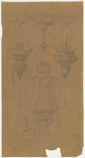 This is a drawing of a Coupe by Firma Feuchère, created with graphite on paper. Notice how the vertical orientation and symmetrical design give the drawing its formal structure. The Coupe's design is a study in contrasts. The precision of the lines creates a framework which encases the ornate details, such as the figures and intricate carvings. The cup's shape is made up of tiers that suggest layers of meaning, each contributing to the whole. At the very top, a cross is placed, creating a visual hierarchy that moves downwards to the more decorative elements. The base provides a strong foundation which anchors the structure and adds to the sculpture's sense of balance. This is not just about aesthetics; the drawing’s visual elements are also about power, design, and representation. Consider how these forms invite ongoing dialogue. The Coupe is less about fixed answers and more about opening pathways of interpretation.