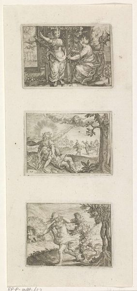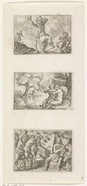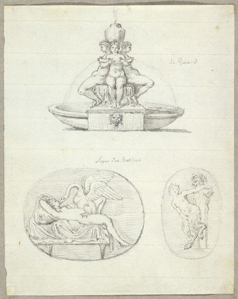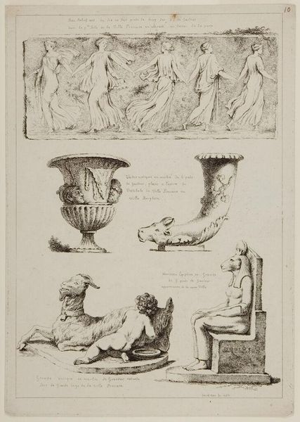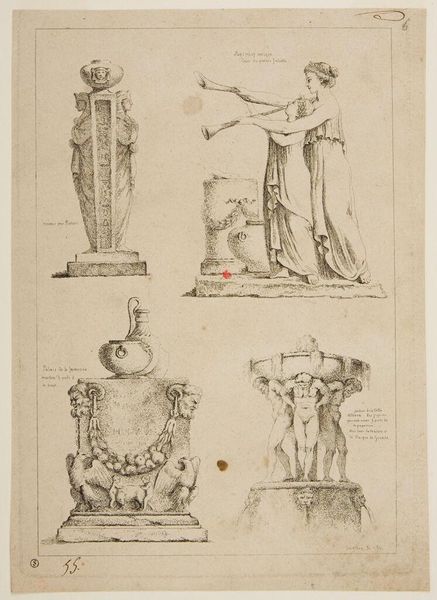 Editor: This print by Jean-Claude Richard, Abbé de Saint-Non, presents a variety of figures and vases. It's interesting how they're all together on one sheet. What do you see in this collection of images? Curator: I see a fascination with the past, a desire to categorize and preserve cultural memory. These images are like relics, each carrying its own symbolic weight. Consider the vases – what do swans and griffins represent? Editor: I guess swans could represent grace, and griffins maybe power? Curator: Precisely. And the crouching dwarf? Perhaps a symbol of the marginalized, yet enduring. This sheet becomes a visual encyclopedia of symbols. What do you make of that? Editor: It's like the artist is inviting us to decode them, to understand the past through these powerful images.