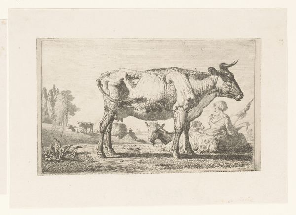 Stefano della Bella created this print, Plate 24: Donkeys, from 'Various animals,' using etching, a medium that lends itself to fine detail. The composition stages the donkeys within a carefully structured landscape. Notice how the artist employs line to define the forms and textures. Della Bella uses hatching and cross-hatching to create a sense of depth and volume. The tonal gradations, achieved through varying densities of lines, give the donkeys a tangible presence, contrasting with the open space of the sky. The arrangement of the donkeys, from the resting figure on the left to the grazing one on the right, creates a sense of movement across the picture plane. Della Bella plays with the conventional expectations of animal portraiture. His approach is not merely representational; he seems interested in the structural aspects of form and how they interact within a defined space. This work destabilizes the traditional hierarchy between subject and background.