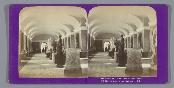 Jean Andrieu captured this stereoscopic image of the Beeldengalerij in the Museo Nacional del Prado. During the 19th century, museums showcased a nation's cultural achievements, but also reinforced prevailing social hierarchies. This gallery presents a curated vision of classical sculpture. The figures, predominantly male and nude, embody ideals of beauty and power rooted in Western art traditions. Andrieu's photograph, made with the stereoscope in mind, invites the viewer to immerse themselves in this constructed reality. It prompts us to reflect on whose bodies and histories are celebrated, and whose are marginalized within these spaces. By considering the dynamics of gender, class, and cultural representation, we gain a deeper understanding of the museum's role in shaping our perceptions of history and identity.