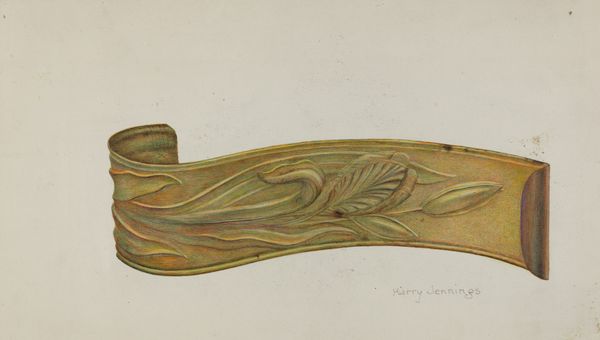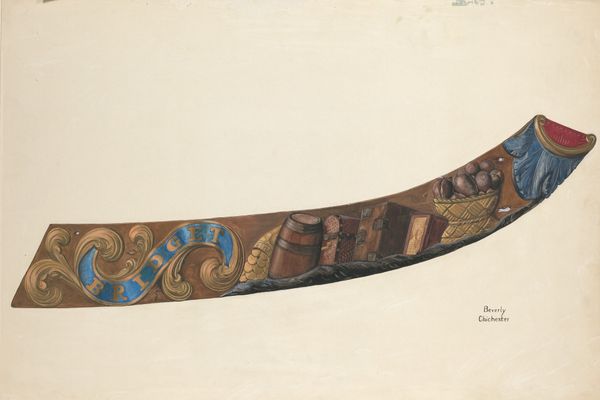 Curator: Here we have a watercolor rendering of a toleware bread tray, created sometime between 1935 and 1942, attributed to Mildred Ford. Editor: It strikes me as both humble and fanciful at the same time. The form of the tray looks simple, almost industrial, but then it's decorated with these charmingly naive fruit motifs. Curator: The toleware tradition itself, the craft of painting on tin, is fascinating. Initially functional objects like these were often elevated through decorative motifs—think folk traditions carrying symbolic weight in everyday life. The apple and other fruit often symbolize abundance, hospitality... even knowledge depending on the context. Editor: It’s interesting how this piece sits between handcraft and potential mass production. Toleware lends itself to duplication. I'm curious about the artist’s process here. Was Ford copying an existing bread tray design, or developing an original concept for production? The watercolors giving it this light airy feeling...I bet the metal piece would be bolder, more forceful! Curator: Given the period, one can imagine the social role of decorative arts offering small moments of beauty in the home—comfort in austerity perhaps? Those colors are so appealing, vibrant, yet the metal itself hints to wartime constraints on certain luxury goods. Editor: And consider who might have owned this type of bread tray. Not the very poor. But likely a middle-class aspiration. It embodies a particular domestic ideal. Did Ford herself see it as "art," or as just a pattern to be replicated by factory workers? Curator: Perhaps that ambiguity is precisely what makes it intriguing. It’s a window into a world where functionality and symbolism were intricately entwined. The artist's labor in rendering this decorative object seems itself meaningful. Editor: Yes, a compelling object of production of cultural and societal ideas of home and the everyday!