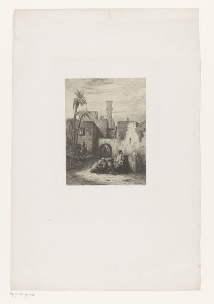 Léopold Flameng created this print, *Stone Carvers in the Courtyard of a Former Carmelite Monastery*, using etching techniques. The composition is structured around a play of light and shadow, which sculpts the architectural forms and the figures of the stone carvers. The sharp contrast creates depth and emphasizes the geometry of the courtyard. The composition draws our attention to the spatial arrangement and the relationships between the architectural elements and the human figures. The stone carvers appear to be dwarfed by the imposing structure of the former monastery, suggesting a comment on the relationship between labor and institutional power. Flameng skillfully uses the semiotic system of architectural space to highlight themes of labor, history, and perhaps, the decline of religious institutions. Notice how the formal elements of the print work together to convey a sense of both the physical reality of the scene and a deeper engagement with its historical and cultural context. The etching, therefore, goes beyond mere representation, becoming a site for interpretation and re-evaluation.