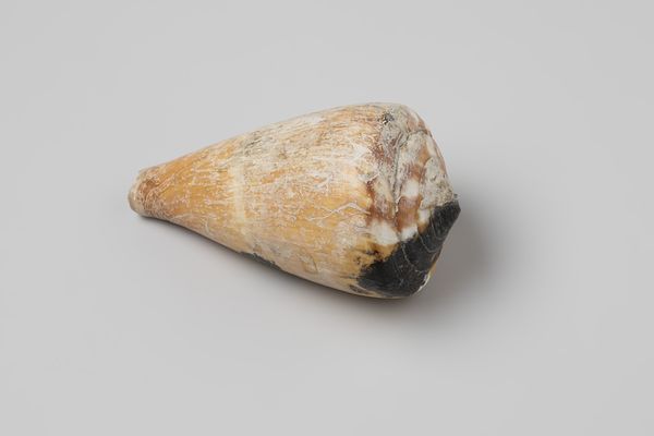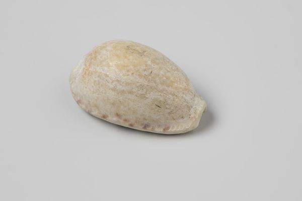 Curator: This is a kauri shell recovered from the wreck of the Dutch East India ship Witte Leeuw, which sank before 1613. Editor: It looks rather humble, doesn’t it? Not what you'd expect from a maritime tragedy, almost ghostly in its pallor and texture. Curator: Ghostly is an interesting term, considering its history. The Witte Leeuw sank after a battle with Portuguese ships, a dramatic moment in the struggle for control of maritime trade routes. These shells, and others like them, were likely cargo, intended as currency or trade goods in Asia. Editor: Currency! So much more than just a shell then. Kauri shells were symbols of wealth and power in many cultures. Their shape, reminiscent of the vulva, connected them to fertility, life, and abundance. This simple object carried immense symbolic weight, making trade about more than just materials. Curator: Precisely. And thinking about its material reality, it endured a shipwreck, years underwater. The alteration of its surface speaks volumes about the forces it has undergone – the chemical reactions, the marine life clinging to it, the sheer pressure. Its current appearance is the outcome of a long, arduous material journey. Editor: So it's transformed by the sea, mirroring its role as a talisman transformed by cultural significance. Both material and symbolic values reshaped through history! I wonder if the sailors understood its layered meanings... Curator: Perhaps some did. We often underestimate the knowledge circulating amongst sailors and traders. These weren’t just shells to them, but portable commodities, cultural tokens with tangible worth in distant markets. The act of diving, collecting, transporting – these involved a complex web of labor and global exchange. Editor: Right, the commodification of symbolic meaning, traveling by ship...It's both sad and compelling that something so small could be central to conflict. Makes you wonder about the human stories intertwined within the shell's pearly layers. Curator: Indeed. It’s a potent reminder that objects are never just objects, but condensed histories, laden with meaning, labor, and the echoes of human lives. Editor: Well put. This kauri shell is definitely more intriguing now than I first thought.