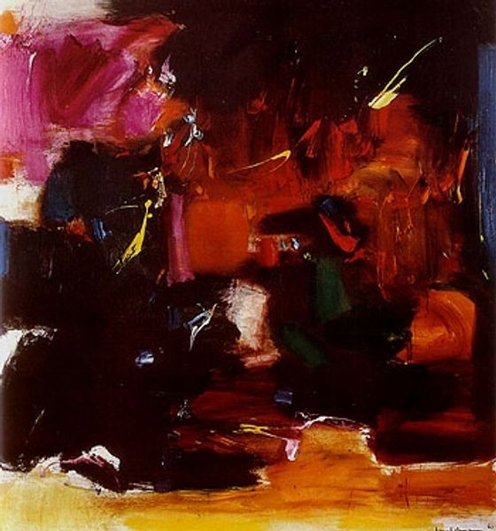Curator: Standing before us is "Negev Celebration," an acrylic on canvas created in 1991 by Alexander Bogen. Editor: My immediate impression is one of radiant chaos! The canvas is dominated by a sunny yellow, yet teeming with complex shapes and what seems to be layered brushstrokes that create a strong emotional pull. Curator: Indeed. Yellow often symbolizes joy, energy, and optimism, but in its intensity here, almost clashes with those jagged shapes. Do you get a sense of conflict or tension within this celebratory expression? Editor: Precisely. I find the imposition of near geometric structures—those squares of red, blue, green and black in the center, for instance—slightly disturbing amidst what otherwise seems like an outburst of expressionist freedom. Semiotically, the angular forms against that ground invoke a sense of imposed order upon untamed landscape. Curator: Fascinating point. One might consider the title in contrast: the Negev, while geographically specific, can represent any arid landscape, demanding celebration of life. Does the contrasting composition offer insight to a forced hope, perhaps? I see figurative traces here and there too - what look like very linear human figures with simple, brushstroke-like details. Editor: I do now see that human element. However, I cannot help but draw focus to the dark mass in the painting's top quadrant; perhaps the shadow of threat against celebration or is the Negev ever truly a safe haven. Curator: Bogen lived through tremendous upheaval as a Jewish artist and partisan fighter. In this painting, you wonder, could be speaking to the layered, and perhaps fraught, layers of survival, celebration and trauma. I cannot help but see his life and perspective as essential to unpacking these emotional registers. Editor: Art making, then, can stand as an allegory for the tensions between individual desires for expression and societal demands of identity and control. That thick impasto becomes less about pure aesthetics and more about the labor of processing. Curator: A wonderful summary that echoes how symbols accumulate depth with experience. Editor: Yes, art as both experience and interpretation, isn't it? Thank you for these intriguing perspectives!