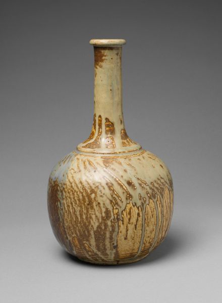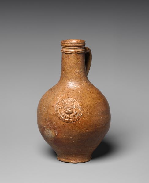 Editor: We’re looking at a "Jug," made sometime between 1810 and 1840. It’s an earthenware piece. I’m really drawn to its simplicity and utilitarian feel; it’s so clearly made for everyday use. What symbols or narratives do you see embedded in this jug? Curator: This jug is indeed humble and evokes nostalgia, but its symbols connect to much deeper, shared memories. Consider the single floral motif—the six-petaled flower. Do those petals feel like decoration alone? Editor: I guess not… They’re so precisely drawn, not haphazard or randomly placed. It gives it importance, I think. Curator: Exactly. Think about similar motifs in other forms of early American folk art – quilts, for example. These floral patterns become shorthand for ideas of growth, abundance, and connection to the land. How might that resonate in a culture that was largely agrarian at the time? Editor: It's like a prayer for a good harvest or a celebration of nature’s gifts. The flower offers a concentrated message of optimism. Curator: Precisely. And even the vessel itself—a container—speaks to holding sustenance, both physical and spiritual. The form recalls ancient amphora and water vessels, a subtle echo of cultures that depended so intimately on the land. Editor: It’s amazing how something that looks so simple can carry so much meaning! I’m now noticing how the brown earth tones further ground the image in the everyday. Curator: Indeed. And understanding those silent symbols enhances our appreciation. It becomes more than a jug; it is a memory vessel holding layers of cultural meaning. Editor: That’s such a beautiful way to put it, a memory vessel. Thanks for highlighting the powerful symbolism in everyday objects.