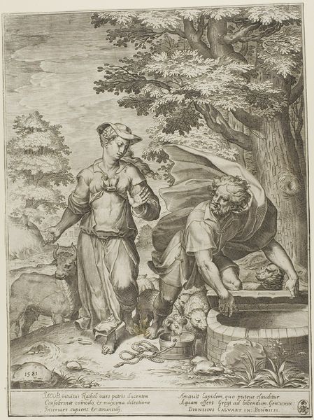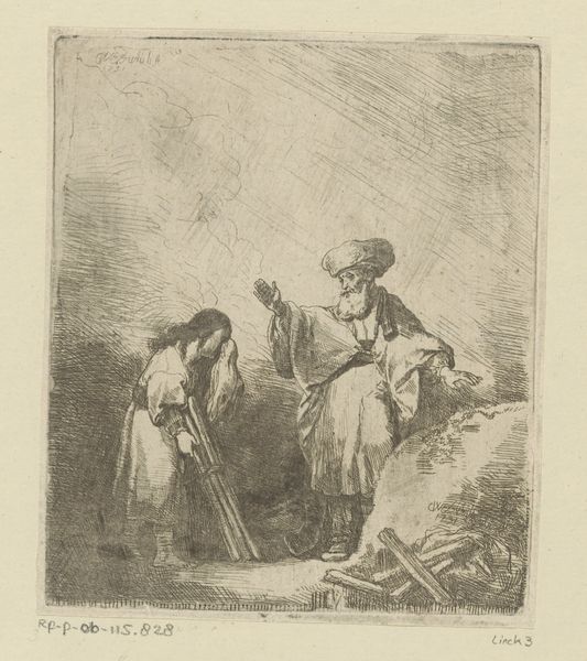 Editor: This etching, “Ezau verkoopt zijn eerstgeboorterecht aan Jakob,” or “Esau selling his birthright to Jacob,” by Pieter Rottermondt, depicts a pretty pivotal Old Testament scene. The mood feels heavy, and yet domestic, like a stage play unfolding in someone's backyard. How would you interpret this work, keeping in mind its historical and cultural context? Curator: The piece seems to engage with a common theme in the Baroque era: examining social hierarchies and moral ambiguities through biblical narrative. Think about how this scene would resonate with a 17th-century audience. What power dynamics are at play, and how does Rottermondt visually communicate them? Editor: Well, Esau looks completely defeated. His slumped posture suggests a lack of awareness about the stakes, even, whereas Jacob, though generous in offering food, has this upright stance and seems keenly aware of the deal he's making. Is the artist making a judgment, then? Curator: It's possible, but it's also about how images construct social perception. Remember that religious imagery served as a form of moral instruction but also as a reflection of societal values. Does the inclusion of details like the simple home setting add to or detract from the power of this scene? Editor: It sort of brings the sacred down to earth. Makes it less about grand morality and more about everyday decisions and their consequences, right? Curator: Precisely. And consider who was commissioning and consuming art at the time. How might their values be reflected in such a portrayal of power, inheritance, and perhaps even social climbing? Editor: So, beyond just the story itself, the image becomes a commentary on social values of that time period, interpreted through a biblical lens and further filtered through who had the privilege to commission such art. That's… surprisingly complex. Curator: Indeed. It invites us to consider the visual language of power and morality across different historical and cultural landscapes. Editor: Thanks. Now I see the exchange is a social reflection frozen in time.