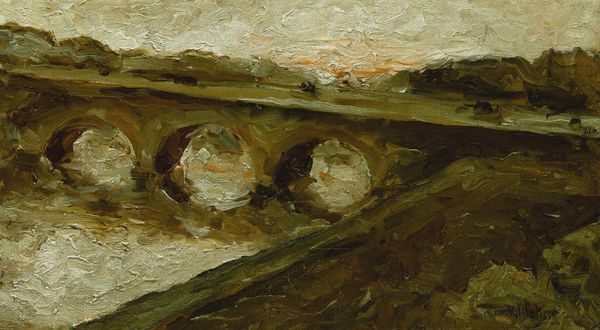 Editor: Here we have Henri Matisse’s "Pont Saint Michel, Paris," painted around 1895. The thickly applied oil paint gives the Parisian cityscape a turbulent feel. What do you see in this work? Curator: Well, given the period, it's tempting to read this through a lens of social upheaval and rapid urbanization. The loose brushwork, the lack of sharp detail... they could signify a fracturing of established societal norms. Paris, in particular, was a hotbed of both artistic innovation and social unrest. How does that tension play out for you? Editor: I see it in the muted colors, almost like the city itself is trying to blend in, even though it's bursting with energy. Curator: Exactly! Think about what it meant for Matisse to choose a cityscape, and particularly this bridge – a site of connection, but also potential division. Post-Impressionism gave artists a fresh license to represent these social dynamics subjectively, so this image becomes more than just scenery; it's a perspective, deeply personal, shaped by a very specific time and place. What kind of stories can we create in order to understand the setting? Editor: I see the beginning of Matisse breaking from Impressionism. This feels… darker, moodier than a Monet. Curator: Indeed! It’s a powerful pivot. Looking closely at the thick impasto and muddied color palette, can we connect it to a potential unease with Paris at that point? Perhaps seeing beyond the romantic idea of city life and into a gritty truth? It also shows how new urban landscapes influenced new kinds of art and representations. Editor: I never thought about it like that. This makes me look at the painting in a different way. Curator: Art provides insight and allows viewers to reflect on contemporary issues. It encourages an evaluation of norms and offers space to question preconceived perceptions of reality. Hopefully we've managed to think about what this reality means and looks like in Paris!