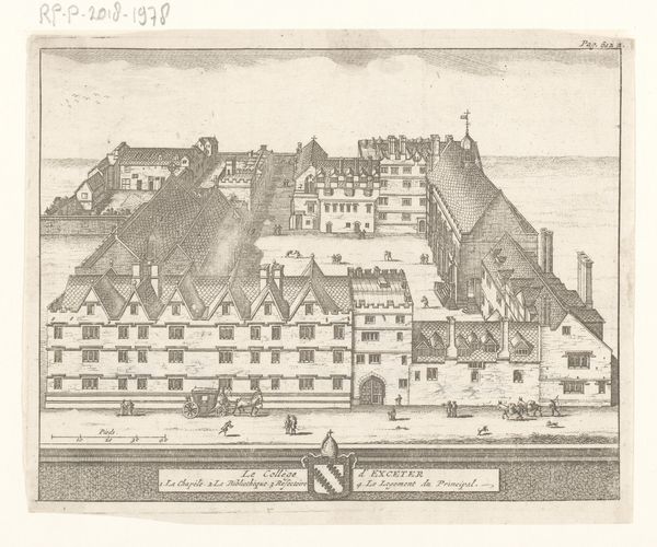 This is an engraving of the Wapenmagazijn of Fort Mont Royal, made around 1702 by an anonymous artist. The composition is dominated by the imposing structure of the armory, rendered with meticulous detail using fine lines. The building's geometric layout is emphasized by the stark contrast between light and shadow, creating a sense of depth and architectural precision. The structural clarity of the engraving invites us to consider how the artist employs perspective and orthogonal lines to convey a sense of order and control. This reflects the broader philosophical concerns of the Enlightenment, where reason and systematic organization were highly valued. Note how the detailed rendering of the building's facade and internal courtyard serves to highlight the functionality and efficiency of the military complex. Ultimately, the engraving functions as both a technical document and a symbolic representation of power. The artist uses linear precision to convey a sense of stability, echoing the Enlightenment’s emphasis on rational design. This engraving encourages us to think about how architectural representation can reinforce cultural values and ideological structures.