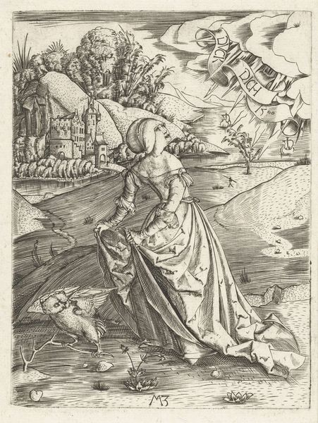 Editor: So, this is 'Kvinden med uglen', or 'Woman with the Owl' by Monogrammist MZ, made sometime between 1489 and 1509. It’s an engraving. I’m struck by the almost dreamlike quality of it, a mix of landscape, portrait, and this bizarre banner in the sky. What's your take on this, seeing it through the lens of materiality? Curator: Well, considering its materiality and process, the engraving reveals a lot about Northern Renaissance printmaking’s function and place in society. The fine lines achieved with the engraving tool tell us about the highly skilled labour involved. It suggests printmaking had moved beyond purely functional religious imagery. Editor: Function beyond religious imagery, how so? Curator: Notice the attention given to the woman's clothing, the details of the landscape, and even the playful interaction with the animals. Engravings like this were becoming commodities themselves, items to be collected and displayed. Who was consuming these, and what was the impact of its circulation? Editor: That’s a really interesting point! Thinking about consumption makes me wonder if prints like this also offered a way for people to engage with art on a more personal level, like an early form of mass media. Curator: Precisely! They made art accessible to a wider audience. The use of copperplate and the development of printing techniques fueled artistic creation, impacting what artists chose to depict and how their work reached the public. What does the image signal of early consumerism? Editor: I never really considered the material production as such a huge influence. Thanks, seeing this engraving as part of a larger economic and social system really changed my perspective. Curator: Indeed! Considering its material and process brings forward significant questions about the social and economic context of art production in the late 15th century.