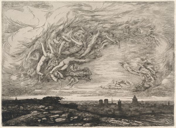 Harry Louis Freund created this print, called 'The Storm,' using etching – a printmaking technique that involves using acid to corrode the lines of an image into a metal plate, which is then inked and pressed onto paper. The visual impact of the artwork hinges on this contrast between light and dark, achieved through the density and depth of the etched lines. Notice how the artist manipulates the etching process to convey a sense of turmoil and struggle. See the figures in this print, their bodies rendered with thick, dark lines suggesting weight and exhaustion. They seem caught in the midst of labor and despair. Freund's choice of etching, with its capacity for detailed and textured depictions, serves to underscore the gravity of the scene, and the raw and visceral qualities inherent in the act of manual creation. This print asks us to consider the amount of work involved in both its making, and the scene it represents. In doing so, it challenges us to consider the relationship between labor, art, and social commentary.