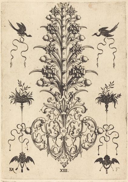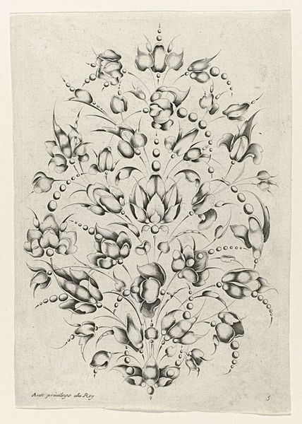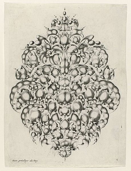 Curator: Look at this remarkably ornate drawing. It’s entitled “Cosse-de-pois ornament voor goudsmeden,” or "Pea Pod Ornament for Goldsmiths," and was created around 1627 by Jacques Briot. Editor: Intricate. My first impression is that the use of light and shadow is masterful, creating almost three-dimensional forms with simple lines and ink. It's visually dense but the symmetry is comforting. Curator: It is Baroque in style, but I see in its geometric construction a reference to earlier emblem books and the use of symbols in Renaissance jewelry, like seeds that embody potential and peas associated with abundance. This piece may also be an allusion to Royal privilege as well. Editor: I'm more intrigued by how the arrangement emphasizes its individual elements. Notice how the play of concave and convex shapes adds dynamism, yet the rhythmic repetition of the forms keeps the overall design stable and balanced. The material rendering creates a sense of volume using just line and wash. Curator: Consider that these ornaments, rendered with pen and ink, were intended as a pattern for goldsmiths. In a way, Briot provides the visual language to manifest specific aspirations related to family, prosperity, or spirituality, aligning individual desires with societal expectations through codified imagery. Editor: You can also read the work in terms of formal harmony. The curved lines soften the geometry, guiding the eye, while the tonal gradations enhance its almost sculptural depth. It suggests movement and vitality even within a static medium. Curator: It's intriguing how Briot transforms a simple design element—the pea pod—into an object capable of expressing deeper human aspirations and a vision of Royal privilege. Editor: The visual rhythm and harmonic balance speak for themselves. I see here a celebration of design’s power to stimulate emotion using fundamental shapes and skillful lines.