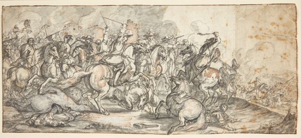 Curator: Before us, we have a drawing titled "Equestrian battle" made sometime between 1598 and 1601 by an anonymous artist. The medium is ink, and it's currently housed here at the SMK, Statens Museum for Kunst. Editor: It’s immediately chaotic, isn’t it? Horses rearing, figures sprawling, all rendered in such fluid lines. It feels less like a depiction of history and more like a visceral sketch of war's frenzied energy. Curator: I find myself focusing on the way the ink defines not just form, but also the motion. You can almost feel the thunder of hooves. Thinking of its material existence, the availability of ink, even the type of paper available back then, these all influence what's possible. Were they using quills? How coarse or fine was the paper? It's all connected to what's portrayed. Editor: Absolutely, it's a fascinating exercise in controlled chaos. What intrigues me is the dreamlike quality, the looseness allowing my mind to fill the space. It reminds me how violence reverberates long after it occurs—we see it in the ink, we sense it in the style. Mannerism often embraced this drama. It captures not necessarily the truth of the battle, but maybe the exaggerated perceptions of those caught within. Curator: That ties to the social context too, right? This would have been viewed by patrons who understood the implications of war, understood the labor required to arm a soldier. So the art reflects this elite worldview back. The materials elevate what would be a kind of reporting on warfare to something beautiful, perhaps masking, maybe celebrating brutality at the same time. Editor: Yes, and even the landscape, barely there in wisps of ink, feels haunted. There’s a flatness to the scene which draws you straight to the human element. There is not a lot of naturalism, the people are the only focus. Curator: Thinking about its placement within the museum’s collection adds another layer. Displaying a piece like this today asks questions about how we memorialize, interpret, even consume depictions of violence. Editor: It invites us, I think, to look deeper at what fuels human conflict. By looking at the way ink and paper meet intention and history, it brings everything back into play. Curator: Ultimately, its immediacy still carries resonance. Seeing the hand of the artist, the frenetic movement captured in a few strokes – it truly embodies a human spirit.