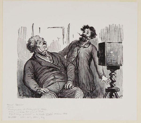 Curator: What a wry observation of the emerging photographic era! This print by Charles Maurand, "Photographes et photographiés, from Tirage Unique de Trente-Six Bois", made sometime between 1862 and 1920, captures a moment of… discomfort. Editor: Yes, discomfort is spot on. The stiff pose, the strained expression—the sitter looks like he’s enduring a medieval torture! All that swirling line work creates a palpable tension. The artist clearly aimed to mock the entire process of portraiture. Curator: Indeed. Maurand uses caricature to great effect here. Photography in its early days was often seen as a tool of bourgeois self-promotion. This image presents an antidote—a jab at that vanity, suggesting the artifice and the, frankly, tediousness of posing for a photograph. The context of history-painting is also an important detail, where one’s personal life was showcased in a dramatized moment to make them look and seem ‘heroic’, regardless of its reality. Editor: And note the photographer himself – a somewhat sinister figure lurking behind the lens, almost like a puppet master. He’s the modern Pygmalion who’s actually extracting his subjects very being through art! We have this powerful dichotomy of photographer versus photographed. Curator: Right! The wood engraving allows for a remarkable level of detail. And look closely at that camera – it's almost anthropomorphic. The rigid boxy shape and support system look mechanical. There is no emotion on either side of this process: you sit still, or risk being nothing more than a smudge on glass. Editor: Precisely, it's that tension between the promise of photographic accuracy and the rather grotesque reality that makes this so compelling. It makes me wonder, what kind of memory Maurand wanted to construct, not for the sitter but society as a whole? Is photography as true a medium as everyone claims, or does it make fools of us all? Curator: Food for thought, and a telling reflection on the democratization of portraiture and the anxieties that accompanied it. Editor: Agreed. It’s fascinating how an image of such simple composition can hold so many layered insights into culture and societal evolution.