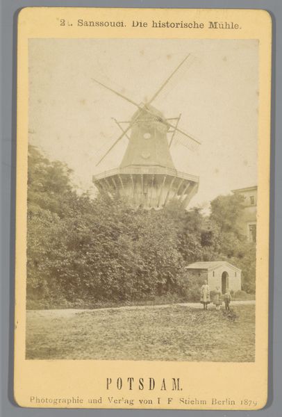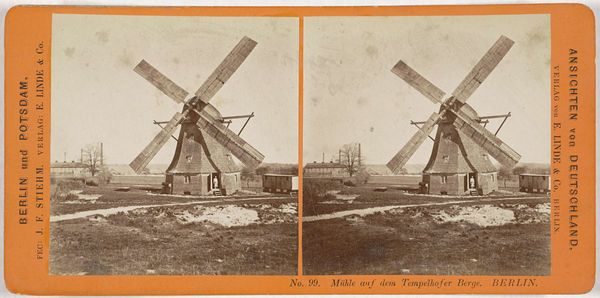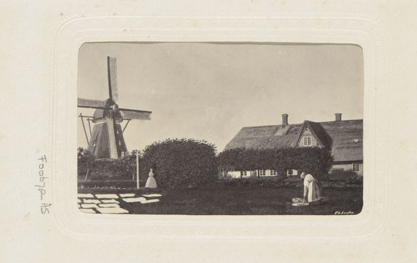 Editor: Here we have Pieter Oosterhuis’s gelatin silver print, "Houtzaagmolen De Jager, tegenwoordig de Zaagmolenstraat, Amsterdam," dating from sometime between 1867 and 1885. It’s a photograph that feels surprisingly timeless despite the clear signs of age. I'm curious – what layers of history and meaning do you see woven into this image? Curator: The Dutch landscape, and especially windmills, are potent symbols. Beyond the immediate picturesque scene, windmills represent ingenuity, a triumph over nature. This photograph, taken during a period of great industrial change, suggests a cultural negotiation. The old ways persist, coexisting, perhaps uneasily, with modern advancements. Consider the stillness of the water reflecting the mill - what does that reflection tell us? Editor: It seems like the reflection creates a sort of doubled reality – a past and present overlapping in the same space. Does the mill itself take on symbolic weight beyond just its function as a sawmill? Curator: Precisely! Mills historically represent transformation, of grain to flour, or in this case, logs into lumber, suggesting progress and utility. However, I find the mill’s physical structure—stark against the muted landscape—imbued with societal notions of progress, community, and even a certain kind of national identity. It prompts reflection: What do these structures whisper about our relationship with time and transformation? Editor: So the photograph uses the familiar, almost nostalgic image of a windmill to make a statement about larger societal shifts and continuities. It’s interesting to think how a seemingly simple photograph can carry so much symbolic weight. Curator: Indeed, photography freezes a moment, yet that moment echoes through cultural memory, inviting us to contemplate our evolving world through the lens of its enduring symbols. We see this image with eyes different from the ones that first viewed it, yet the cultural roots remain visible.