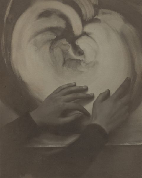 Editor: Here we have Alfred Stieglitz's photograph "Georgia O'Keeffe," taken between 1919 and 1920. It’s a gelatin-silver print, and what immediately strikes me is how the hands seem to speak louder than the face. What do you make of that dynamic? Curator: It's fascinating how Stieglitz uses O'Keeffe's hands almost as symbolic figures. Throughout history, hands have represented creation, action, even vulnerability. Think about religious iconography or even ancient hand stencils in caves. Editor: So you see a deliberate invocation of historical symbolism? Is it intentional on Stieglitz’s part or just inherent? Curator: I believe it's quite deliberate. Stieglitz was deeply aware of art history. The upward reaching hand—that’s almost a supplicant gesture, no? And paired with her watchful face, there’s an emotional tension that resonates across cultures. Think of similar gestures across illuminated manuscripts, or Byzantine icons... they share a desire to connect with something larger than themselves. Editor: I didn't think of religious art, but now I can't unsee it. Curator: Consider how light and shadow are deployed as well; they accentuate specific aspects. Hands held in the light are being brought forth, displayed for an intimate ritual; and what feelings does that create? Is this tension of exposure something intimate or vulnerable? Editor: It definitely reframes my understanding. Before, I just saw a beautiful composition. Now I’m seeing this intense dialogue of reaching, watching, showing… it makes it more alive, somehow. Curator: Exactly. The image carries echoes of those earlier visual languages. These echoes shape our understanding and emotional connection. Editor: It makes me consider how artists pull from visual culture knowingly or unknowingly, to forge emotional responses in their own work, interesting!