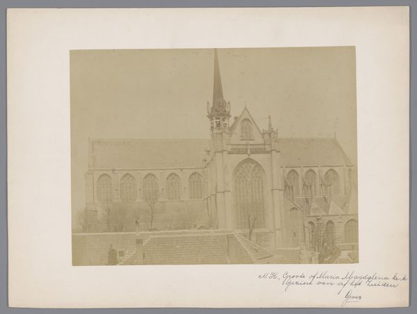 Curator: This photograph, taken in 1902, captures the Nederlands-hervormde Prinsekerk in Rotterdam. The photographer is anonymous, and what a deceptively calm, still image this is. Editor: There's something incredibly austere about it, even a little cold. The pale tones and the rigid lines of the building give it a sense of almost imposing authority. Curator: That's interesting. Considering the historical context, it’s useful to view this through the lens of power structures. Religious institutions often held significant social and political sway, didn't they? Editor: Absolutely. Think about the architectural language. The tall windows and gabled façade, while typical of church design, also represent an aspiration for spiritual ascension and a connection to the divine. It visually reinforces the church’s role as an intermediary between humanity and something higher. Curator: I agree. And if we situate this image in relation to broader historical narratives, Rotterdam was experiencing significant industrial growth at the turn of the century. Images of religious structures could be viewed as an effort to maintain established social orders amidst such rapid changes and rising class tensions. Editor: That's astute. Those arches and repeated window shapes evoke continuity, hinting at timeless values even when everything else in the world is in flux. You also sense, paradoxically, the individual against the whole, since the anonymous citizens appear very small beneath this monolithic church. Curator: It also reminds me that our engagement with built heritage is deeply intertwined with identity. The Prinsekerk’s architecture speaks to the values and beliefs of a specific community within a specific time. Its very construction embodies privilege, doesn't it? Editor: Indeed, looking closer, I see that the light emphasizes some windows while throwing others in shadow, perhaps indicating complex, layered levels of symbolic access within the church community. It is worth investigating further! Curator: Such compelling food for thought as we navigate history through architecture. It underscores how the past reverberates through images like this one. Editor: Yes. It will stick with me – the stark facade, and the human desire for symbols, structures and belief systems to lean on.