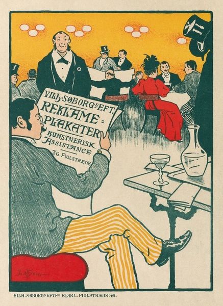 Editor: So, this poster is called "Absinthe extra-supérieure J. Édouard Pernot" by Leonetto Cappiello, placing it around 1900-1905. It's undeniably striking, especially with the caricature style. What immediately jumps out at you when you see it? Curator: Well, aside from the bold aesthetic of the Art Nouveau style typical of advertisement of the time, my eyes are drawn to the careful visual encoding of bourgeois leisure and the burgeoning absinthe culture. Consider the exaggerated features: they act almost as talismans, connecting to archetypal figures. Do you recognize what the artist invokes in the visual contrast between man and woman, in the balance of dark colors with the bright hue of the alcoholic beverage? Editor: I think I see it – the man’s darker tones give a sense of established societal norms, while the absinthe, and perhaps the woman herself, hints at something…freer? Curator: Precisely. It’s no accident. The green liquid and her bright red hat aren’t just colors; they're potent signifiers challenging social structures. Green was commonly associated with envy or jealousy in European traditions, with other dark forces also. Is this drink, therefore, the key to crossing boundaries or simply a tempting trap? Consider the psychological pull and its effect on its first audience. What sort of message were they to expect after one or two glasses? Editor: I never considered how much weight simple elements like color can hold. It really does become a loaded image when you dig deeper. Curator: Indeed. By understanding these visual keys, we decode the cultural values circulating at the turn of the century, and appreciate the power of the poster far beyond just selling a drink. Editor: I see now that advertisement carries far more of a story that initially perceived.