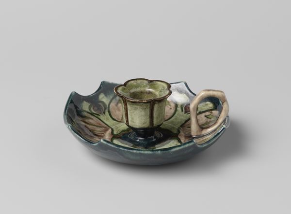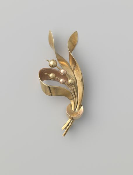 Curator: We’re looking at a brooch designed by Lodewijk Willem van Kooten, dating from around 1908 to 1911. It presents a very precise geometric construction, and its golden framework encases a striking green gem at its center. Editor: The rigidity of those lines and angles… there’s an immediate formality to it. Almost architectural, really. The interplay of that sharp-cut jewel and hard-edged setting is quite arresting. Curator: Indeed. Kooten was part of the Dutch Nieuwe Kunst movement. They were striving to integrate art into everyday life. This piece exemplifies that aspiration, moving away from overly ornate styles in favor of streamlined aesthetics. Think about the political implications of accessibility that it speaks to. Editor: Absolutely. That central stone... the specific shade of green, coupled with those almost stern lines... It evokes a feeling of guarded prosperity, wouldn’t you agree? The geometric arrangement around it creates a halo effect, elevating the central stone almost to a point of veneration. It speaks of earthly power and privilege. Curator: Note those small squares of what appears to be blue enamel at the periphery, which function both to punctuate and soften the sharp angles. What kind of association could the wearers have been trying to convey with a square? Blue also usually implies that a message has been written, especially regarding power. Editor: It could also have implied safety. Blue, through its associations with the Virgin Mary and the color’s status as a ward from the evil eye, suggests protection and blessing. It may represent a wish for well-being to come over the gem and by extension, the wearer of this jewel. And it provides a small dose of humanizing softness to what would otherwise be an expression of pure modernist dogma. Curator: Yes, the integration of those blue accents adds a needed dimension. This work presents more than simple geometry; it is about constructing a revised notion of art's societal purpose. Kooten really wanted to create objects that spoke to changing social mores and desires for simplicity. Editor: Ultimately, I read this jewel as a piece that is striving for timelessness through those crisp geometric patterns and that enduringly fascinating, centrally positioned gemstone. There is something powerful at play here in terms of aspiration and visual symbolism. Curator: This brooch offers such a compelling encapsulation of art’s dialogue with modern society during a formative era, the tensions it held, and the aesthetics it embraced. Editor: Yes. Seeing how simple shapes can signify so much makes you appreciate its ability to hold the weight of a period, a worldview and even wishes of safeguarding all at once.