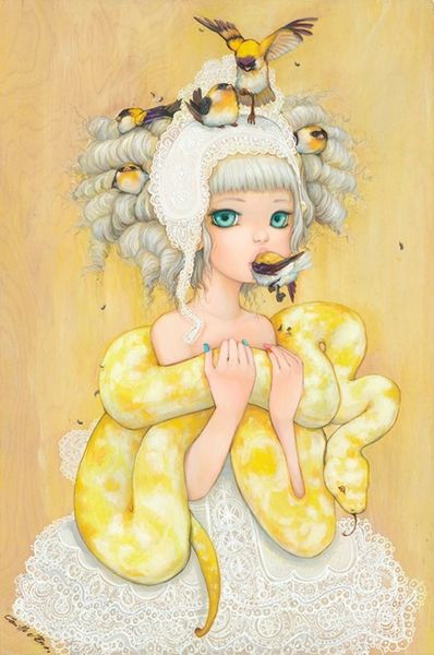 Curator: Camilla d'Errico's "Dear Flavo" from 2020 is an oil painting rendered in hyperreal detail with distinct surrealist underpinnings. What are your initial thoughts? Editor: It strikes me as oddly melancholic. The overwhelming yellow palette is bright, but the girl's eyes, her slightly downturned lips, they suggest a hidden sorrow. And what is with the animals on her head and arms? Curator: The choice of oil paint is significant. It's a medium associated with the Old Masters, historically tied to wealth and patronage. D'Errico is invoking that tradition while depicting contemporary pop-surrealism. The material itself implies a connection to art history and the institutional power that defined it. Editor: Interesting. So, you're saying that she’s almost playing with the canon, subverting its expected themes with this doll-like figure and a quirky menagerie? Her posture is very formal, similar to renaissance portraits. What is the role of realism? Is it adding authenticity? Curator: Exactly. The technical skill in rendering the texture of the fur, the scales of the fish—that demands our attention. It forces us to confront the artifice, the sheer labor that goes into constructing this bizarre scene. There’s an implied commentary on commodity culture, on the manufactured nature of even our most "authentic" desires. Everything appears as a precious consumer good. Editor: It does make you wonder about the role of childhood and innocence here, doesn't it? The child almost feels posed like a collector or displayer of precious goods. Curator: And the "Dear Flavo" of the title? It suggests an intimate connection, perhaps even exploitation of resources—the child's relationship to the animals reflects our collective relationship with the natural world. Editor: Looking closer, all those figures—the animals and the child— are of different sizes and textures. What impact does it have on the symbolism? Curator: Consider the production process, all those brushstrokes adding up, building an assemblage. Also, do we buy that everything is randomly chosen? Nothing could be further from the truth; everything suggests artifice. Editor: I came in focused on a melancholic story being communicated. However, seeing the production efforts you highlighted helps recontextualize the work within commodity consumption. Curator: I've appreciated this shift from simply feeling to actively seeing what is materially there and how it implicates labor and a social framework for commodity appreciation.