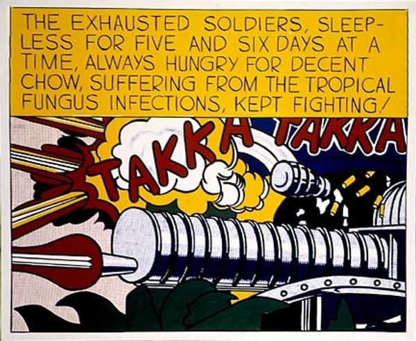 Curator: Pow! This is Roy Lichtenstein’s “As I Opened Fire," a print from 1966, a time when art was really grappling with the impact of mass media. It’s so vibrant, what strikes you first? Editor: It’s got this instant graphic punch, doesn’t it? Like a comic book exploding off the page. The simplified shapes, those Ben-Day dots... it feels immediate, even visceral. But also kind of detached, ironically. It's violence aestheticized. Curator: That detachment is key to Lichtenstein’s genius. He's appropriating comic book imagery – essentially readymade narratives – and presenting them as high art. He forces us to reconsider what's worthy of artistic representation. Editor: I'm curious, thinking about how Lichtenstein found source material. Did the reality of actual combat ever intersect with his use of these kinds of wartime images? Curator: Good question! World War II undoubtedly seeped into popular culture, so while Lichtenstein certainly wasn't glorifying war, I'd say he was showing it how the world already saw it – repackaged and sanitized for mass consumption. Editor: Right, the comic panels become cultural shorthand. Like, BAM! Here’s your accessible, neatly packaged understanding of conflict. There's no mess or pain, just bold outlines and onomatopoeia. And what about this phrase “BRAT!”, what should we make of it? Curator: It could speak to a sense of recklessness, maybe. A comment about youth's relation to war. It certainly contrasts to the calm, calculating opening line. This work really invites us to question the nature of the spectacle and our complicity as viewers, I'd argue. Editor: Complicity...yes, a tricky thing with these iconic works. Thanks for your illuminating insights. Curator: Likewise, your gut-level impressions always cut to the core of what makes art impactful, regardless of the era it emerges from!