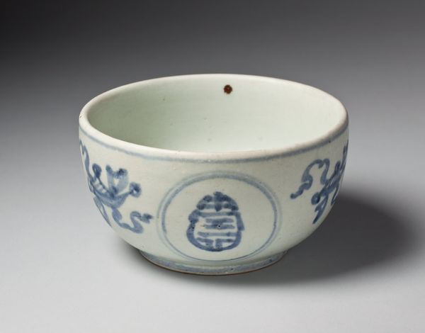 Editor: We're looking at a ceramic bowl dating back to the 19th century. The description notes a Chinese character symbolizing longevity, and it's currently held at the Minneapolis Institute of Art. It’s beautifully simple, almost austere. How do you see this object within its cultural context? Curator: It's fascinating how a seemingly simple bowl can tell us so much. Consider the role of ceramics in Chinese society at the time. Were such objects exclusively for the elite, or did they serve a broader public function? Editor: That's interesting. I suppose I assumed something made with such care was intended for someone wealthy. Curator: Perhaps. However, even if produced for an upper class, its symbolism - longevity - speaks to a universally desired virtue. Consider also how the presentation of food, even the vessels used, conveyed status and cultural values. Was this bowl part of elaborate feasts? Or more intimate, personal meals? What purpose did this ceramic bowl serve to the person using it and those who may have viewed it? Editor: I see. The longevity symbol, being centrally placed, was surely significant. I wonder how the bowl was received – what impact such craftsmanship and cultural imagery had on everyday life back then. Curator: Precisely! This wasn't merely a functional object; it was embedded within social and cultural hierarchies, and carried powerful symbolic weight. And what we consider "art" today, was then simply considered as a cultural material. Thinking about this piece has made me aware of the subtle cultural messages even everyday objects transmit. Editor: It’s given me a totally different perspective. I initially saw beauty, but now realize how deeply intertwined the piece is with cultural meanings and socio-political structures of the 19th century. Thanks!