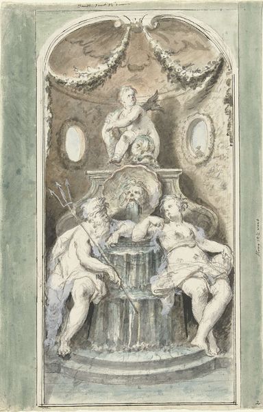 Curator: Welcome. We're standing before a drawing by Daniël Marot, dating roughly from 1701 to 1769, titled "Ontwerp voor een prieel van groen latwerk, waarin drie putti met dieren spelen" - or, "Design for an arbour of green latticework, in which three putti play with animals". It's rendered in ink. Editor: My first impression is one of lightness and aspiration, almost theatrical in its composition. The linear elements, especially those of the architecture, suggest a space that’s more about prospect and pleasure than enclosure. Curator: Indeed. The structure offers an elegant framework. Observe the precision of the linework, establishing a clear visual hierarchy. The circular motifs repeated throughout contribute to a sense of formal balance, wouldn’t you agree? The putti, strategically placed, are visually anchored yet also dynamically arranged. Editor: Precisely. Those cherubic figures bring a wealth of symbolic baggage. The bird cage, for example, isn't just a cage – it’s a symbol of the soul or of captivity, juxtaposed with the freedom of the bird held aloft. Consider also the horn being offered by the cherub. It feels related to an idealized Golden Age. It all has to do with memory and the past. Curator: The narrative elements serve to animate the structural design. But it’s through the modulation of light and shadow, achieved solely through line density and the selective application of washes, that the architectural features gain volume and depth. Editor: Agreed. What's also interesting is how these Baroque motifs would speak to the patron of the time. They are playing with established symbols and ideas of aristocracy to create a familiar language, or, to communicate themes around wealth, taste, or aspiration. Curator: Precisely. The interplay of organic and geometric forms suggests a world where nature and human ingenuity are perfectly aligned. It’s an idealized vision realized with masterful precision. Editor: Well, for me, it all points to the deep symbolism of the Baroque and reminds me how images accrue layers of significance over the centuries. Curator: And from my point of view, we’ve examined a fascinating exercise in form, light, and composition that speaks to the essence of visual harmony.