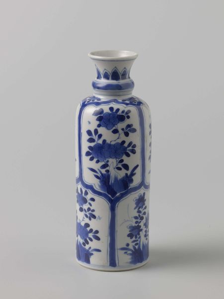 Editor: Standing here, looking at this porcelain vase, one of a pair, crafted around 1760 by the Worcester Royal Porcelain Company… it’s simply striking how vivid the cobalt blue decoration remains. What leaps out to you when you see a piece like this? Curator: Immediately, I'm transported! The delicate blue patterns dancing across the porcelain aren't just decoration, are they? They're whispers of faraway lands, dreams spun from silk and spice routes. It makes me think of ladies with powdered wigs sipping tea, surrounded by chinoiserie, each piece hinting at the exotic orient. It is Orientalism. Do you find your imagination drifting similarly, when looking at this object? Editor: Definitely. There’s a certain escapism embedded in it. Almost a Rococo fantasy. Curator: Precisely. Think of Rococo like the powdered sugar on a fancy cake. That lighthearted extravagance pairs oddly with the... yearning for the ‘other’ that the Eastern motifs present here. There is an elegance that still has an energy, doesn’t it? But where do you think its cultural import lies now? Editor: That’s an interesting question. Now? Maybe it's in the way it makes us consider the history of trade, collecting, and how cultures have always borrowed and re-imagined each other's designs. It feels like looking at a beautiful, slightly complicated artifact from the past. Curator: I agree. Complicated, but, oh, so lovely.