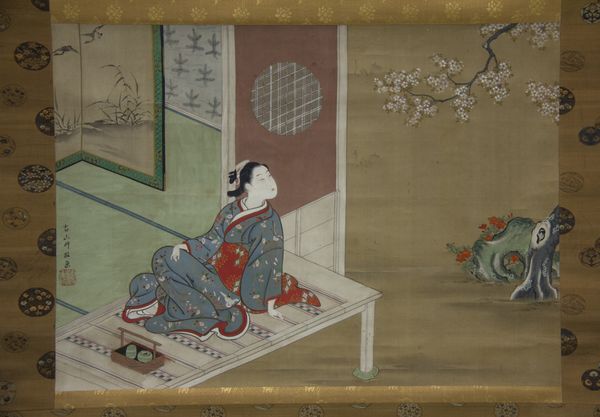 Editor: This is "Kabuki Play Kusazuribiki from the Tales of Soga", an 18th-century watercolor by Okumura Masanobu, currently at the Metropolitan Museum. The scene feels tense, with one figure kneeling before another who holds a sword. How do you interpret this work, especially considering its narrative context? Curator: This work offers us a fascinating lens through which to examine power dynamics and social expectations within the Kabuki tradition and 18th-century Japanese society. Think about the figure with the sword; how are we meant to perceive her agency? Is this a subversion or reinforcement of gender roles within the context of Kabuki, where male actors often play female roles? Editor: That's interesting. I hadn’t considered the performative aspect and its relation to gender. The kneeling figure seems submissive, yet the sword suggests a potential for resistance. Curator: Exactly. Consider also the “Tales of Soga,” the narrative source of this play, steeped in themes of revenge and loyalty. How might this context inform our understanding of the relationship between these figures? What societal norms are being upheld or challenged? Is it really about the individual or a performance? Editor: I see. So it’s not just about the immediate action, but also the cultural and historical weight of the story and its representation on stage. Curator: Precisely. Looking closely, you realize the print provides more than a glimpse into a specific play, it mirrors a meditation on identity, social structures, and narrative tradition within a specific time. Editor: Thanks for this deep dive; it highlights the need to consider artwork within multilayered cultural contexts. Curator: Absolutely. The beauty of art history lies in understanding how these contexts shape both the creation and the reception of an artwork.