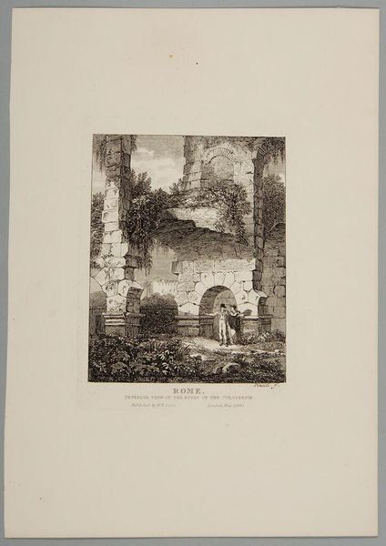 Curator: Bartolomeo Pinelli's etching, "Place called the 'Seven Halls'," presents a stark, shadowy view of Roman ruins. The heavy use of chiaroscuro creates a dramatic, almost theatrical atmosphere. Editor: It evokes a sense of historical weight, doesn't it? The monks seem dwarfed by the architecture, almost as if time itself is a character in the scene. Curator: Precisely, the composition guides the eye through a series of arches, drawing us deeper into the space. This layering also creates a fascinating play of light and shadow, emphasizing the monumentality of the structure. Editor: And the choice of figures surely reinforces the Church's enduring presence amidst decaying grandeur. Pinelli's commentary on institutional resilience is subtle yet poignant. Curator: Indeed, the contrasting textures—rough stone versus the smooth garments—add visual interest. Overall, a very sophisticated manipulation of form and light. Editor: A haunting depiction, prompting reflection on the interplay between past and present, power and decay. Curator: A compelling study in contrasts.