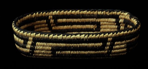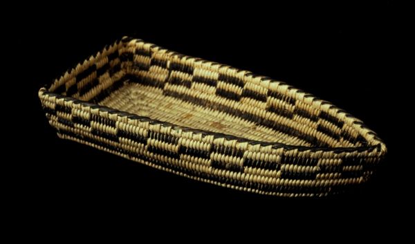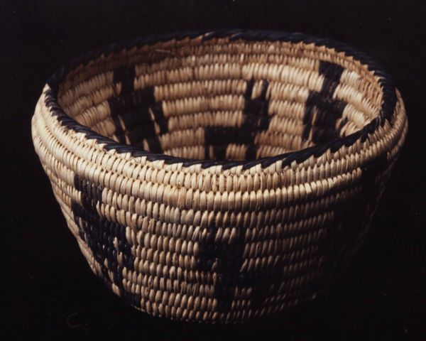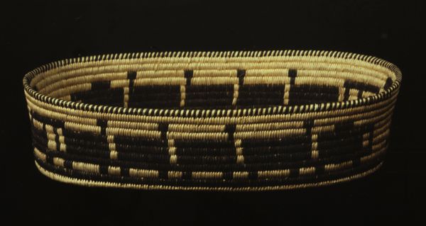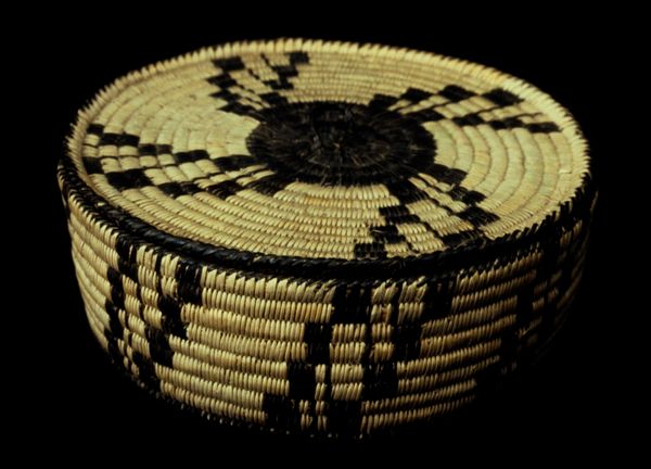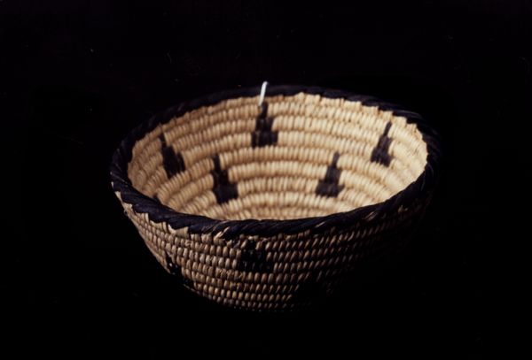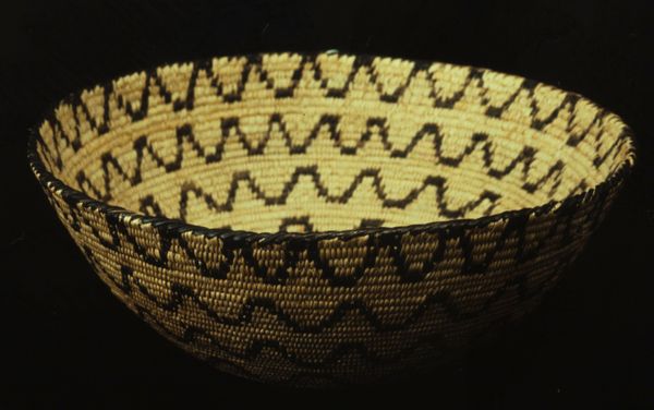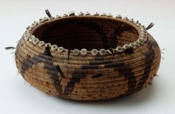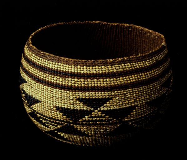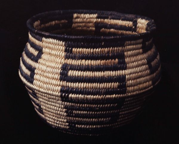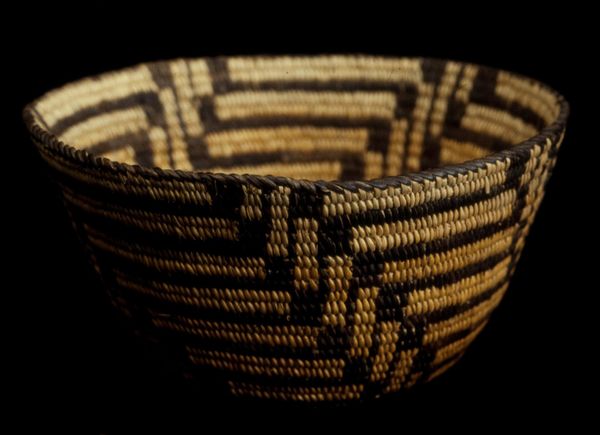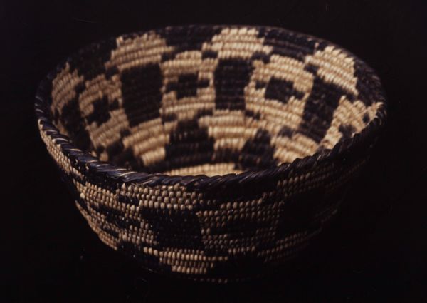 Curator: I find this Apache basket from around the 20th century strikingly elegant. It is housed right here at the Minneapolis Institute of Art. Editor: The high contrast gives it such immediate visual impact. I see alternating dark and light bands, with these strong geometric shapes…are they triangles? Almost a stepped pyramid motif. Curator: Precisely. It's the mastery of technique blended with cultural significance. The Indé, or Apache, people wove these baskets for both practical use and ceremonial purposes. The geometric patterns aren't just decorative; they carry stories, histories, and connections to the land. Editor: Semiotically fascinating. The shapes resolve into these higher-order graphic signs...each an element within an organizing binary between positive and negative space, or figure and ground. How does the cultural context change how these images can be read? Curator: Well, the weaving process itself speaks to Apache resilience and ingenuity, handed down through generations of women. Each stitch represents a continuation of tradition, a reclaiming of Indigenous identity amidst ongoing colonialism. We must recognize that artistic expression is resistance, not simply aesthetic pleasure. Editor: I recognize and acknowledge that. I simply observe that the interplay of textures too – the dark fibers against the lighter ones– gives such tangible depth. And that meticulous coiling! It produces a lovely three-dimensional object. Curator: Woven artistry represents so much more than a "lovely object"; we can honor these women's labor, skills and worldview. Appreciating their perspective is essential, for a deeper recognition of Indigenous communities’ vital contribution. Editor: Thank you for clarifying, there are indeed multiple interpretations present. Considering its patterns and technique has allowed me a richer understanding of its value.