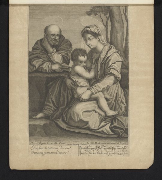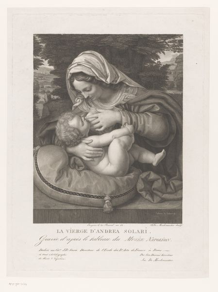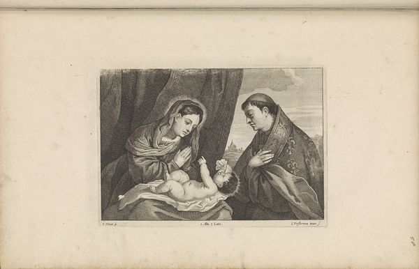 Curator: We’re looking at “Maria met Kind en ezel,” an engraving made after 1716, now housed at the Rijksmuseum. Editor: It's stark and striking. The grayness lends it a raw quality, emphasizing the human experience of motherhood even in this sacred depiction. Curator: Absolutely. Think about the process of engraving; each line is a deliberate mark, demanding a different kind of labor than painting. How might the limitations of this medium shape the narrative, especially regarding Mary’s role and experience? The inscription gives us more insight, referencing Cardinal Nerii Corsini. Editor: Good point. Engraving was such a crucial technology for disseminating images. So, while on the surface, it is a typical depiction of the Madonna and Child, its materiality reveals something about its purpose—mass consumption and replication in baroque society. The lines are efficient. Curator: It certainly allows for widespread consumption, and dissemination of power. Think about the implied social context here. A woman and child on the margins are brought to the center, not merely for sentimental reasons, but because that vulnerability itself could serve a political purpose, emphasizing certain church values. The image is intended to evoke a powerful set of social expectations. Editor: The use of light and shadow is quite pronounced. I'm drawn to how the stark light emphasizes the textures around her; not silks and jewels, but hay, rough cloth, and her own skin as a symbol of the humble scene of Jesus's birth. How does that direct the viewers reading of wealth? Curator: It disrupts those hierarchies, which speaks volumes when the artwork’s commission came from within the church. We might view this image, and similar works in the period, as expressions of societal negotiation. Editor: I see the print more clearly now, the material conditions of its making in this religious setting makes for an intriguing perspective on devotion. Curator: Agreed. Considering the confluence of religious and social narratives intertwined with materiality gives us rich avenues of contemplation.
