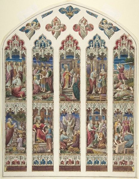 Editor: This mosaic by Józef Mehoffer, "Saints, bishops and deacons" from 1917, is stunning. The figures are so intricately rendered within these geometric patterns. The light shining through must be incredible. What strikes you most about it? Curator: What I find compelling is how Mehoffer, working in the early 20th century, uses a medium so deeply tied to the history of religious institutions to engage with contemporary ideas about national identity and spiritual authority. He’s working at a time of immense social and political upheaval, where the power structures that traditionally supported the church are being questioned. Notice how the figures, though rendered in a recognizably religious style, seem individualized, almost nationalistic in their bearing. How do you think this contributes to a broader narrative? Editor: That's interesting, because I initially saw them simply as traditional religious figures. So you're saying that the way they are depicted could be interpreted as reflecting a sense of cultural or national identity? Curator: Exactly! Consider the historical context: Poland had been partitioned for over a century. Artists often turned to religious and historical themes to explore Polish identity. By individualizing these religious figures and embedding them within such a rich symbolic framework, Mehoffer potentially suggests a unique cultural and spiritual heritage. And it makes me wonder how that resonated with a congregation in Fribourg, Switzerland. Editor: So it's not just about religious devotion, but also about claiming a cultural space through art? That definitely shifts how I see the work, connecting it to broader issues of power, identity and representation. Curator: Precisely! And it reminds us how even seemingly traditional art can be deeply engaged with pressing contemporary questions. What new questions does this bring to your mind? Editor: This makes me realize how important it is to look beyond the surface of religious art. Thank you for shedding light on these historical contexts. Curator: My pleasure. It’s through these intersectional lenses that we truly begin to unpack the complexities embedded within artworks.