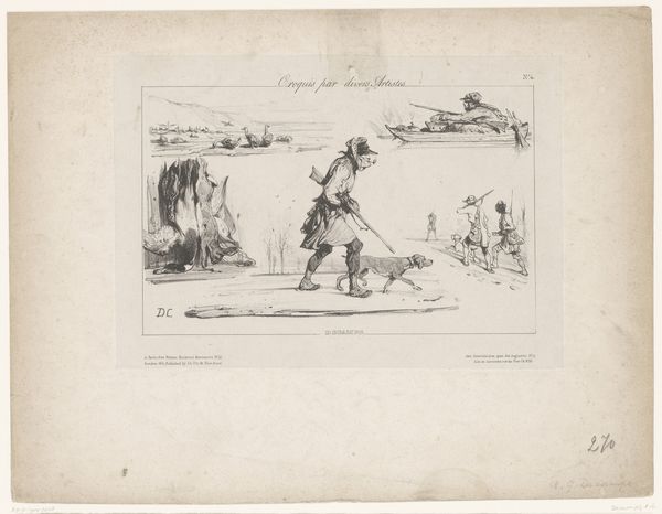 Editor: So, this is "Seated Hunter with a Dog," an 1823 lithograph by N.B. Krossing. There’s something melancholic about it. The hunter seems weary. What symbols or ideas stand out to you in this piece? Curator: Immediately, the pairing of man and animal evokes a classical trope – a commentary on humanity's relationship with nature. But notice how Krossing depicts the dog: somewhat unkempt, mirroring, perhaps, the hunter's own dishevelment. Is it a faithful companion, or does its wilder appearance speak to untamed aspects of the hunter’s nature? What does it remind *you* of? Editor: I think the dog might symbolize loyalty but also a kind of primal instinct, set against the hunter's attempt to be refined with his attire. Does that connect with the Romantic landscape aesthetic? Curator: Precisely. Romanticism grappled with the tension between civilization and the natural world. The crumbling structure in the background… it's not merely architectural detail. It echoes the themes of decay, the passage of time, and the fragility of human endeavors, doesn’t it? These melancholic Romantic symbols create that strong sense of atmosphere. Editor: So the whole image becomes a commentary on the transient nature of life itself? Curator: It does. It uses recognizable imagery – the hunter, the dog, the ruins – to evoke feelings and associations rooted in cultural memory. The romantic ideal places an emphasis on feeling, right? And each element builds upon the others, drawing from that rich symbolic well. Editor: This makes me appreciate how even seemingly simple genre scenes can hold deeper, more complex meanings. Curator: Absolutely! Images speak a language all their own. Learning to decipher that language unlocks so much understanding.