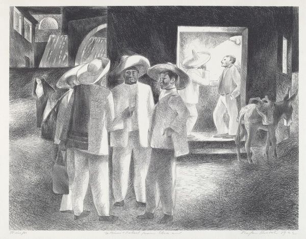 Editor: This compelling charcoal drawing, "Untitled (Sailors on shore)" by Martin Jackson, presents a scene that feels both animated and unsettling. What historical undercurrents might inform this work? Curator: Indeed. Let’s consider the era; although undated, its themes echo the Ashcan School’s gritty urban realism. I see social commentary embedded within its style, but let's not divorce it from issues of race and class often overlooked. What specific details give you pause? Editor: It’s the caricature-like depiction of some figures that stands out. There's a contrast in how the sailors are drawn compared to the people in the background. Could that difference carry a particular meaning, perhaps regarding social standing? Curator: Absolutely. Those depictions might speak to the complicated ways marginalized communities are represented – and often, misrepresented. How does the work make you reflect on historical portrayals of different groups? Editor: It's uncomfortable, realizing how easily art can perpetuate stereotypes, even unintentionally. I'm also now considering the gaze of the artist, Martin Jackson, and his position when creating this drawing. Curator: Exactly! Now, let's consider who gets to tell whose story, and what responsibility the artist has. Understanding these power dynamics helps us to have informed dialogues with the artwork and appreciate their multiple layered meanings, not just passively look at them. Editor: It's fascinating and uncomfortable to engage with art in this way; I appreciate your insights into social dynamics within artworks. Thank you. Curator: My pleasure. By understanding these complexities, we become more thoughtful viewers.