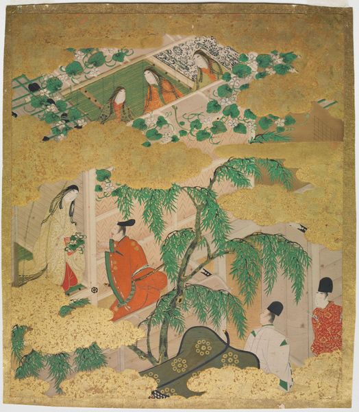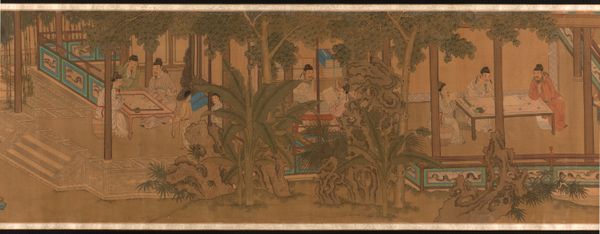 Curator: I’m struck by the whimsical charm of this scene. It is an "Embroidered Chair Back" crafted between 1755 and 1765, now housed at the Metropolitan Museum of Art. The identity of the needleworker is unknown, though the museum attributes it to Mehitable Starkey, the fiber-art rendering displays a tableau of rural life with human figures amidst a pastoral backdrop teeming with birds and animals. Editor: The embroidery work, rendered on textile, exudes a strong horizontal rhythm. Note how the landscape is structured into layers: from the foreground populated with deer, to a mid-ground showing several buildings, finally arriving at the background where human figures frolic near other buildings, the upper part of the image framed with tall and leafy trees. It produces a peculiar feeling; there's almost a sense of fairytale about it. Curator: Yes, the placement of people in such close proximity to both the livestock in the background brings a sense of domestic familiarity that speaks volumes. But I read something different here, more complex. During this period, domestic crafts were tools for women's expressions—they afforded a certain level of agency, albeit within the domestic sphere, by enabling them to represent their world. The depiction of rural idyll could also subtly challenge perceptions about social structures or the landed gentry, allowing for a delicate dance between artistry and muted social commentary. Editor: Perhaps, but before getting there, consider the rendering of space and form. The artist utilizes flat, stylized forms to evoke the texture of foliage, figures, and architecture; consider, also, how each component receives nearly the same amount of meticulous and obsessive laboring attention and treatment, whether animal, vegetable, mineral, or human. Curator: Certainly. The materiality of the piece contributes to the narrative and its cultural meanings. And there is such freedom here in both the design and subject matter that I'm compelled to place it in its specific cultural setting; needlework held a distinct place, marking gendered labor, expressions, and acts of resistance in their own right. Editor: Still, it is equally relevant to observe that the chromatic unity—predominantly of blue, goldenrod, and reddish hues—lends to the object a notable elegance and harmony, and despite its density, the composition avoids any true crowding or sense of compression. Curator: Looking at the piece as a historical object alongside its artistry and aesthetic impact allows me to see deeper and, equally, invites more critical reflection. Editor: I’d say its most striking feature is simply the commitment with which forms and the chromatic design appear to meet in satisfying aesthetic unity.